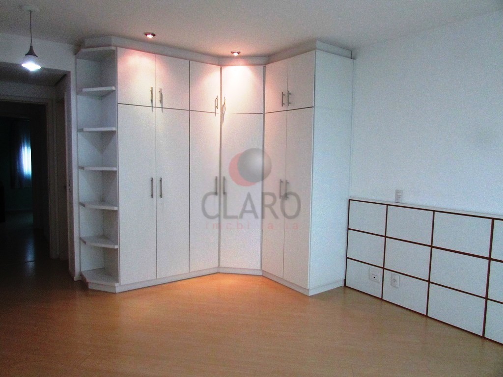 - Quarto com armários planejados, bancada, cortinas, iluminação e piso laminado