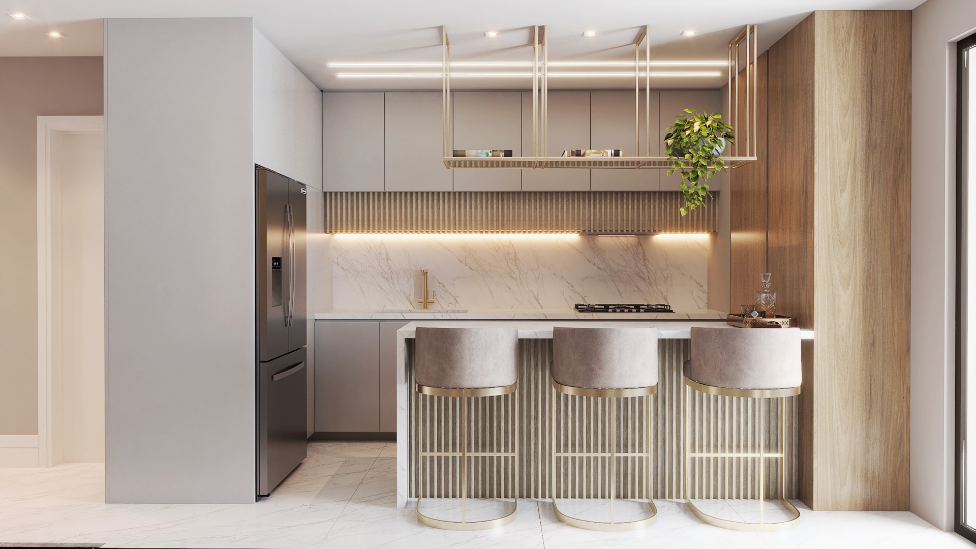 Entre os diferenciais de acabamento estão o piso em porcelanato na sala e áreas molhadas, piso vinílico nos dormitórios, venezianas automatizadas nos quartos, metais monocomando da marca Docol, preparação para ar-condicionado com área técnica e tampos em granito nos banheiros.