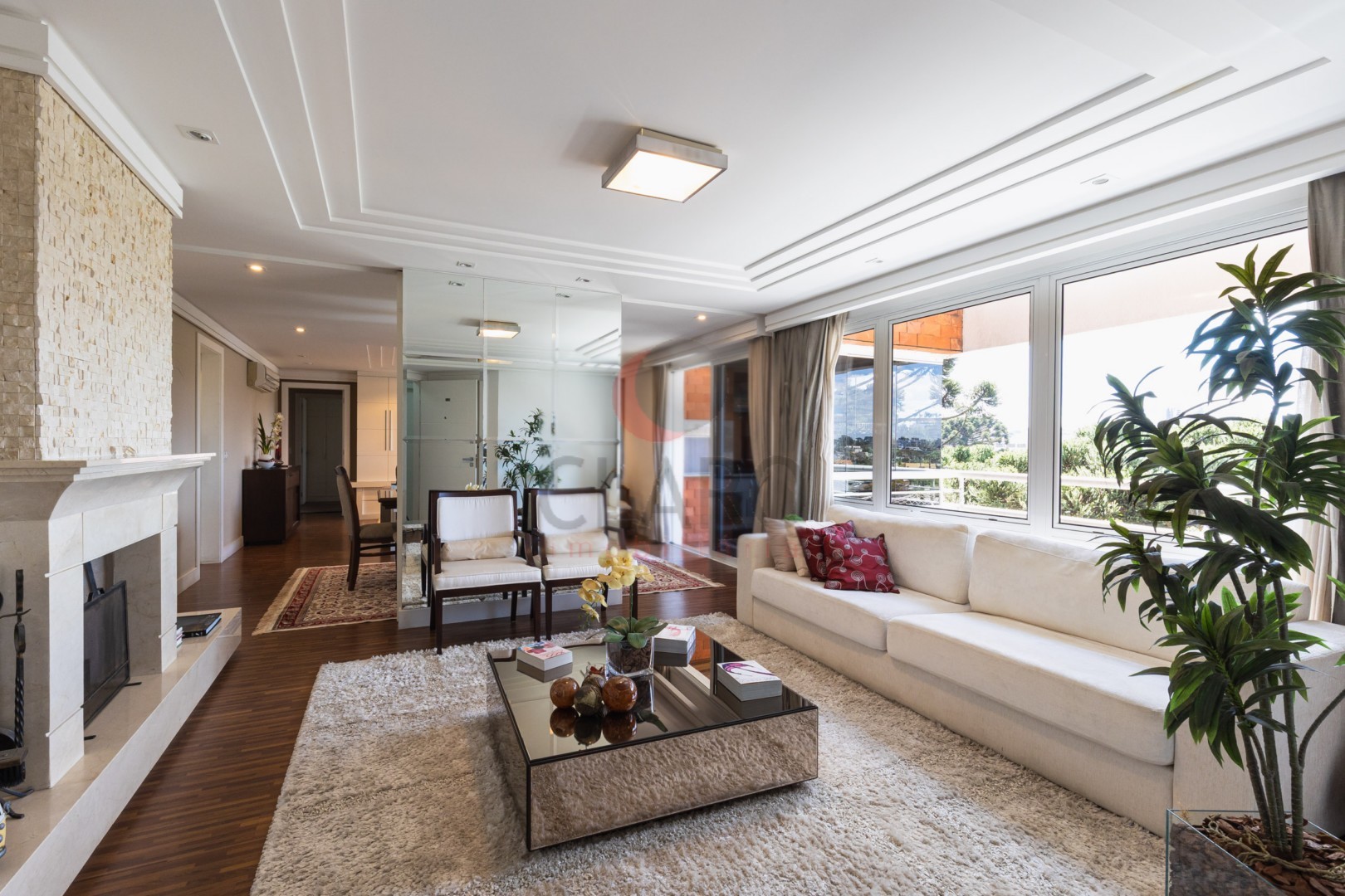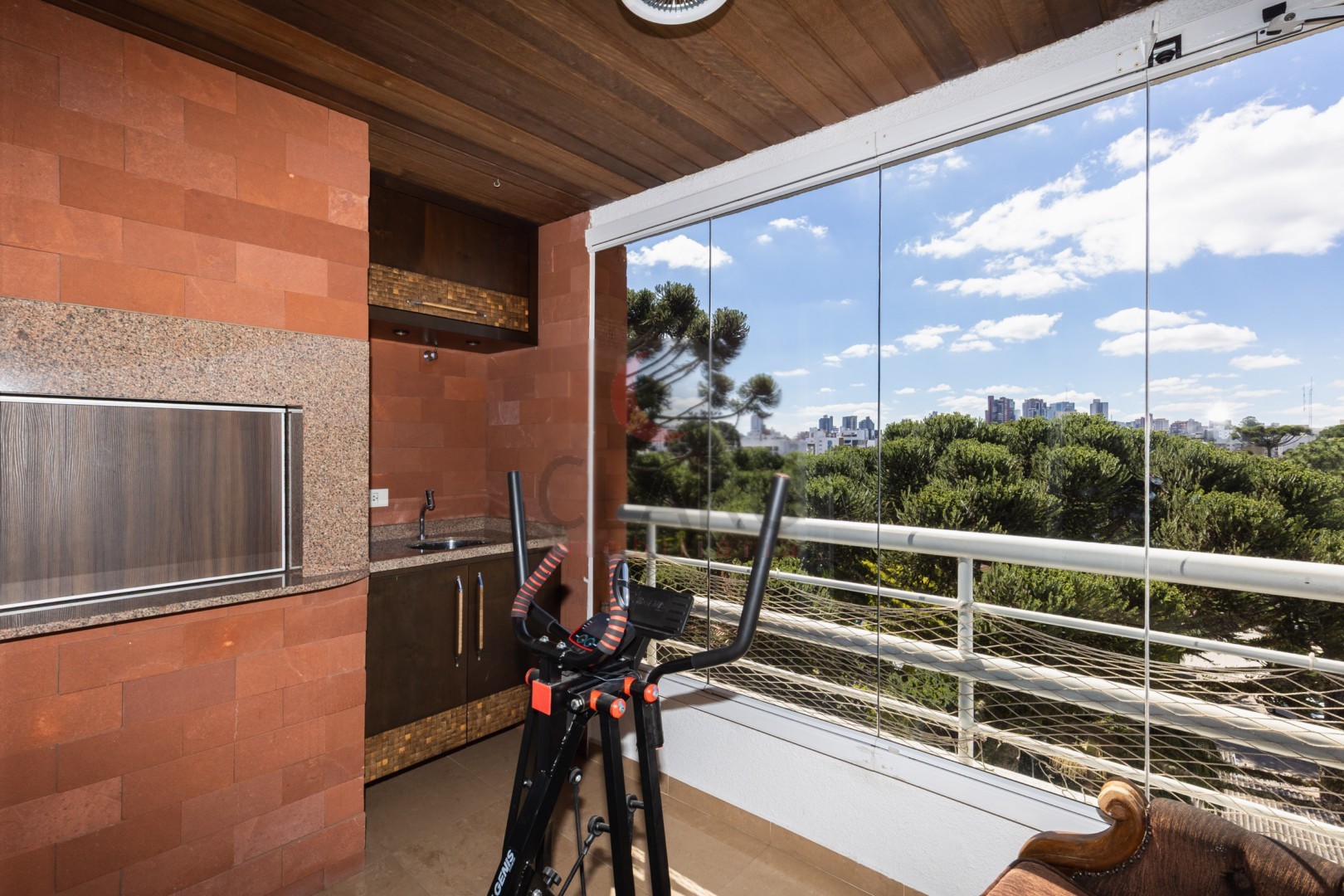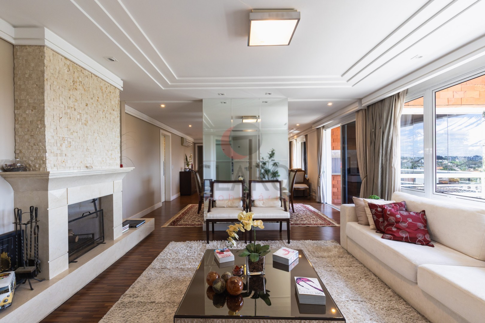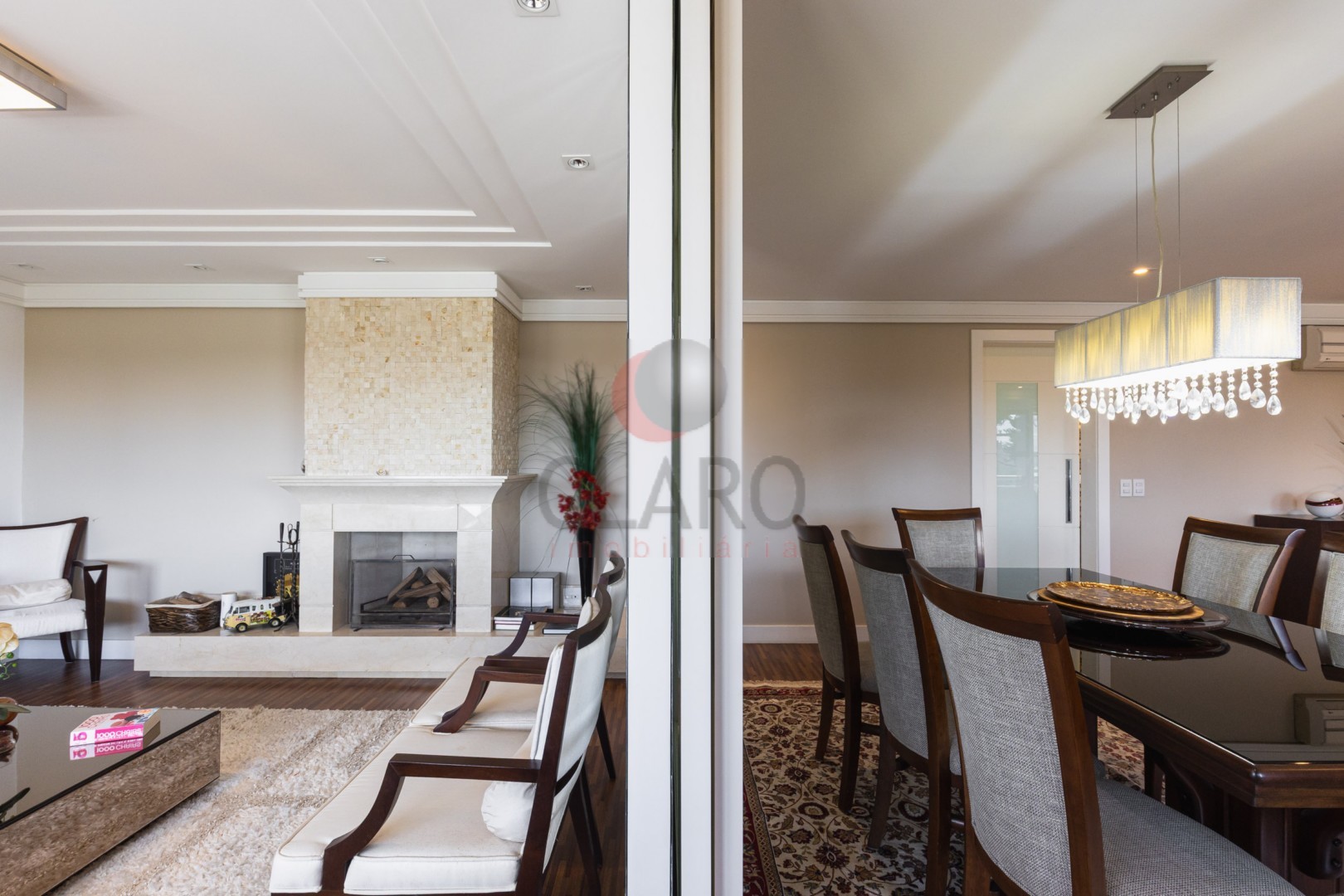 Sala ampla arejada ventilada, envidraçada e ensolarada com painel para tv, lareira revestida em mármore, lavabo com bancada e piso em mármore, Varanda com churrasqueira a carvão com bancada em granito, pia e armários com fechamento em vidro sistema reiki, cozinha com armários planejados, bancada para refeições rápidas, fogão embutido, coifa embutida, Lavanderia completa com armários planejados, dependência completa de empregada, Três suítes com armários planejados, (sendo a master com closet, banheiro com hidromassagem, armário planejado, bancada em mármore e espelho).