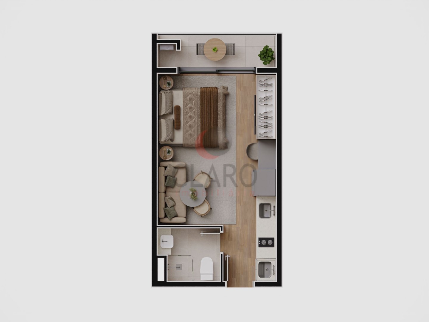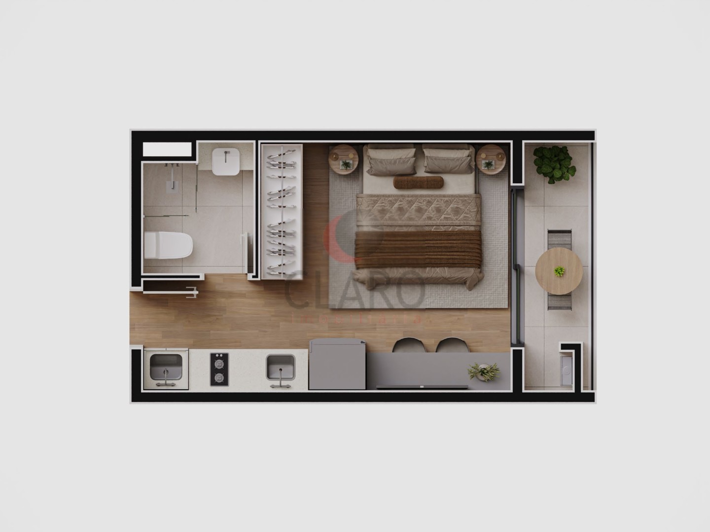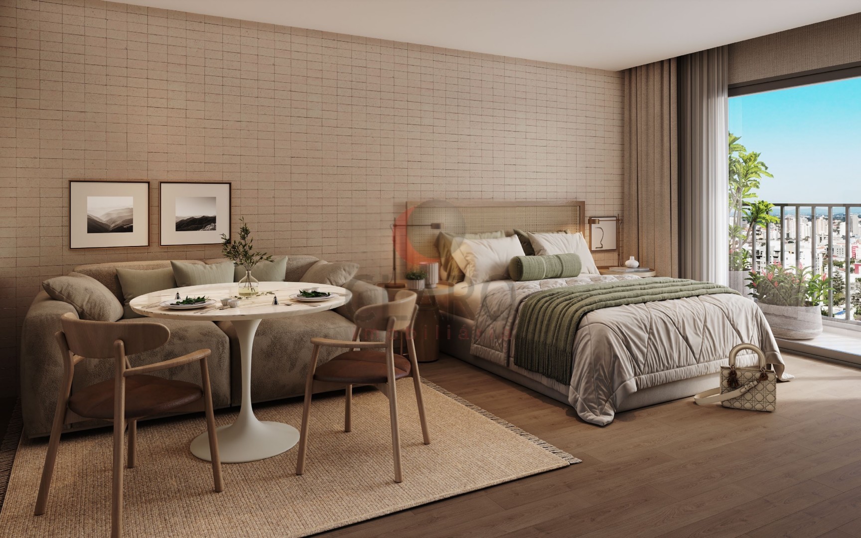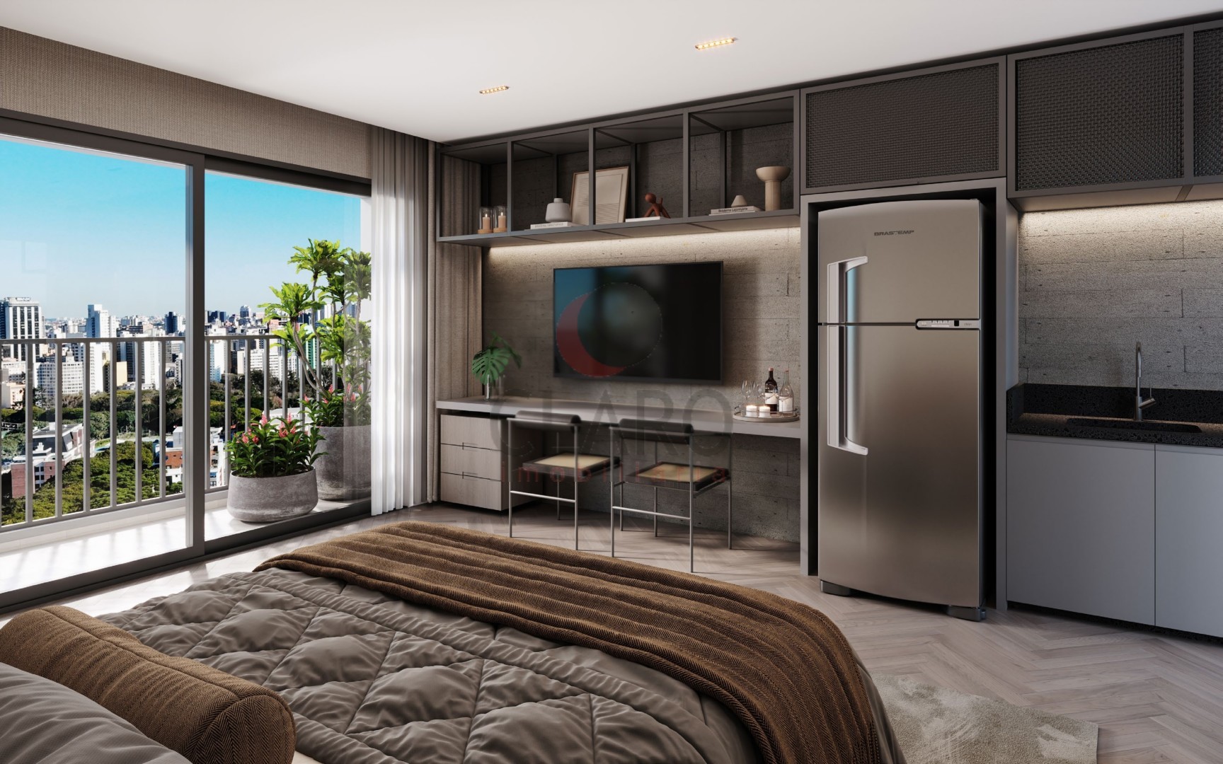 Opções de studio, 1 dormitório e 2 dormitórios.