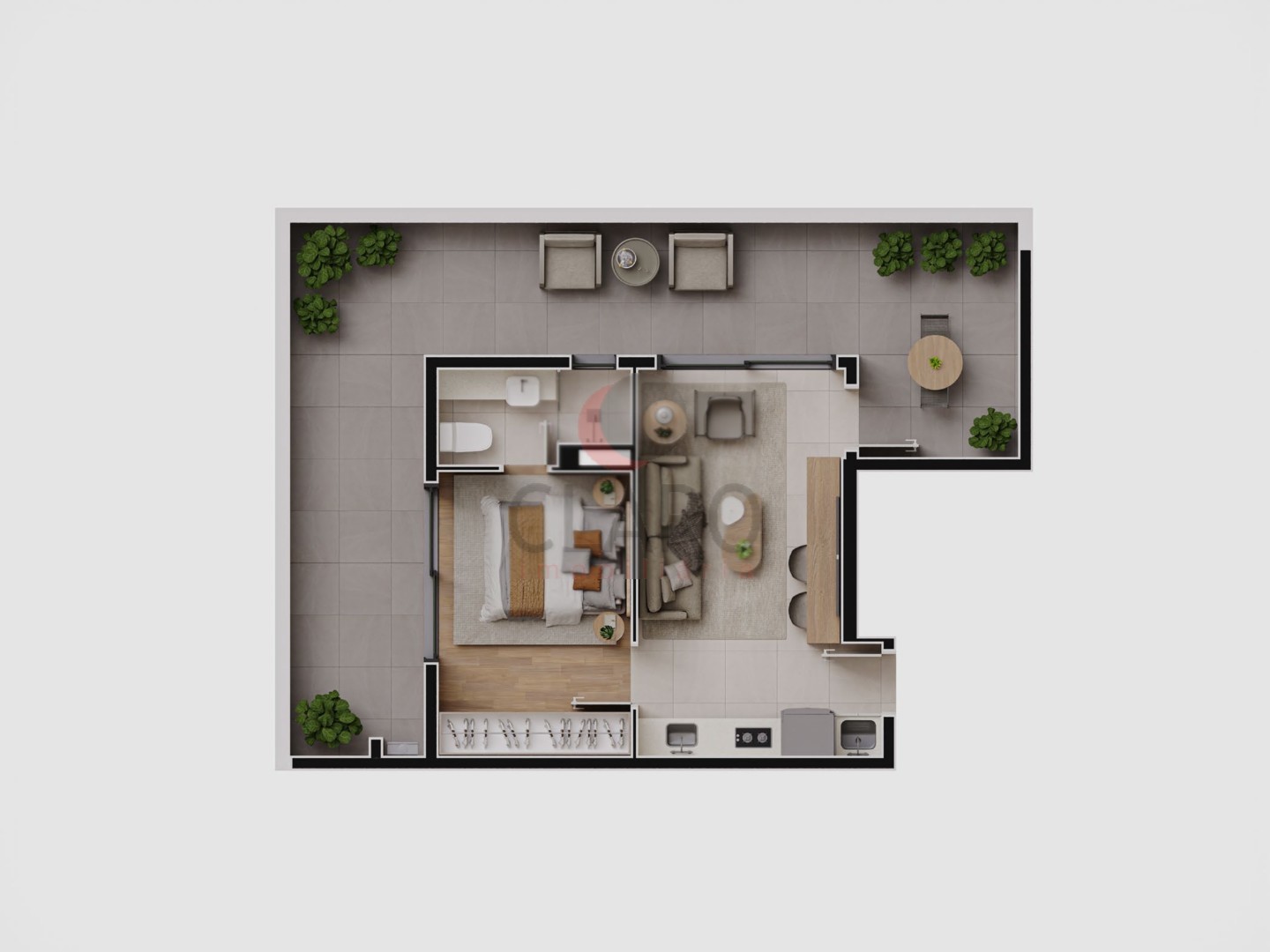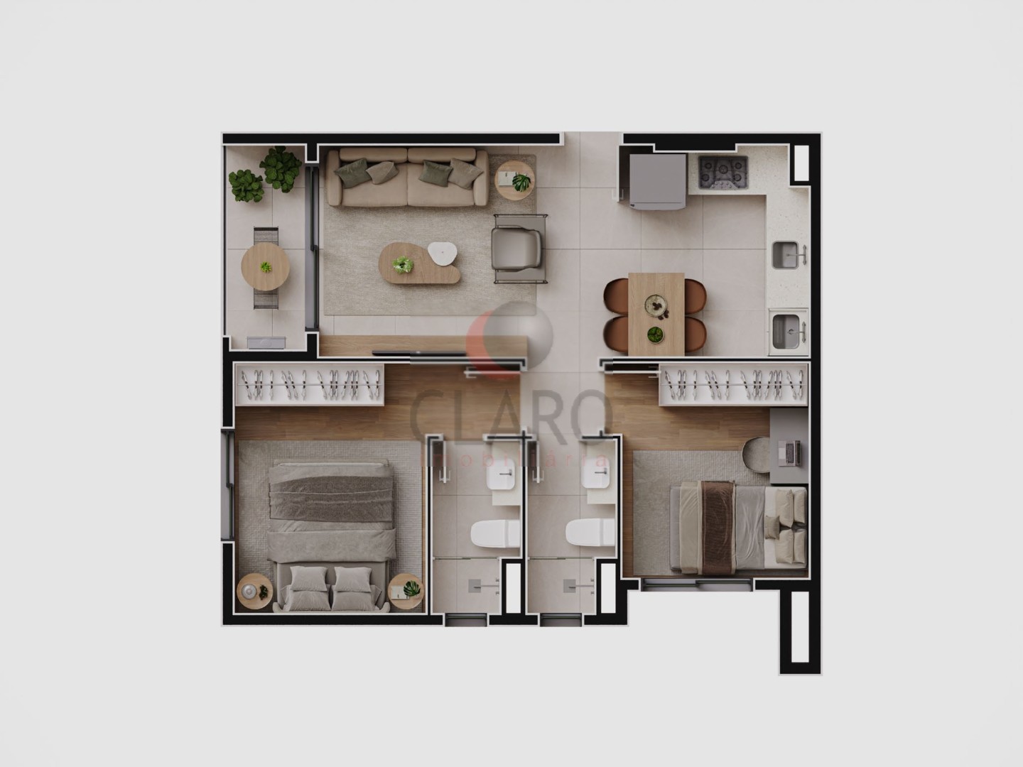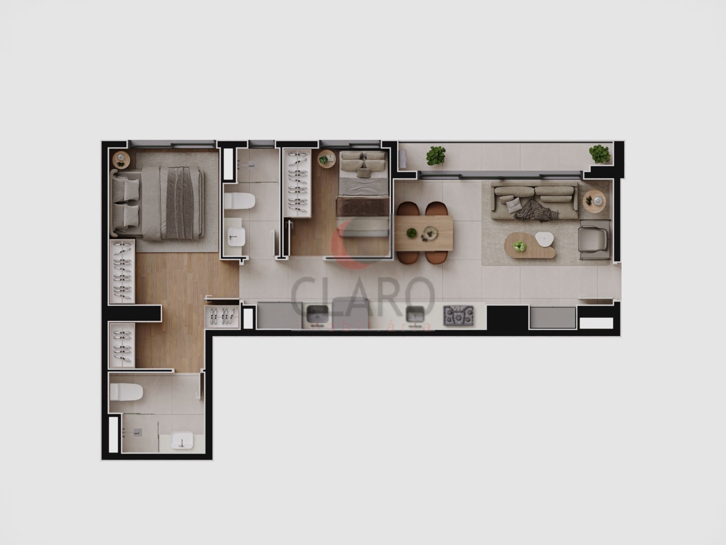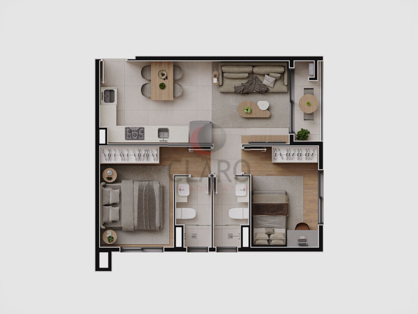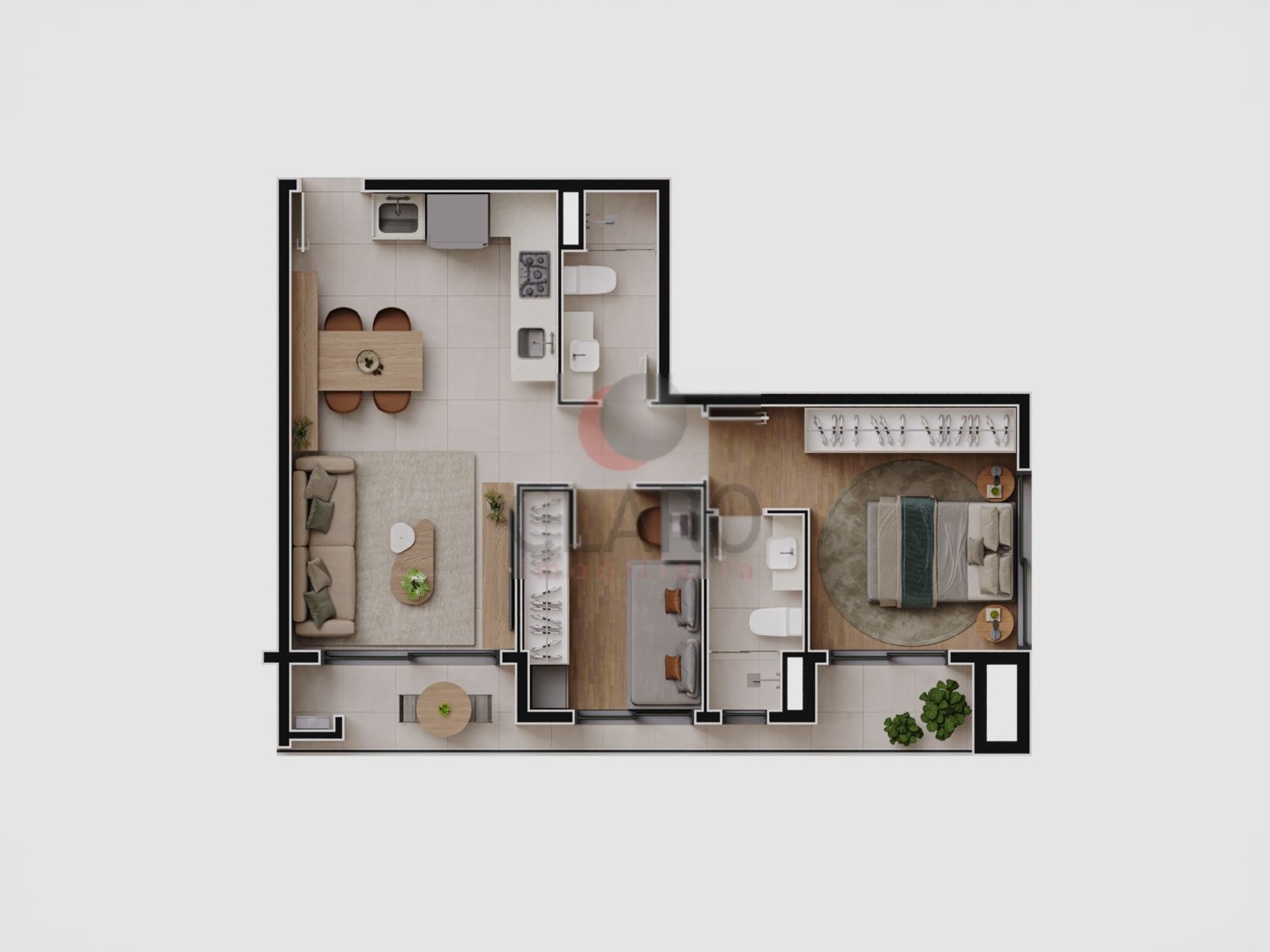 Opções de studio, 1 dormitório e 2 dormitórios.